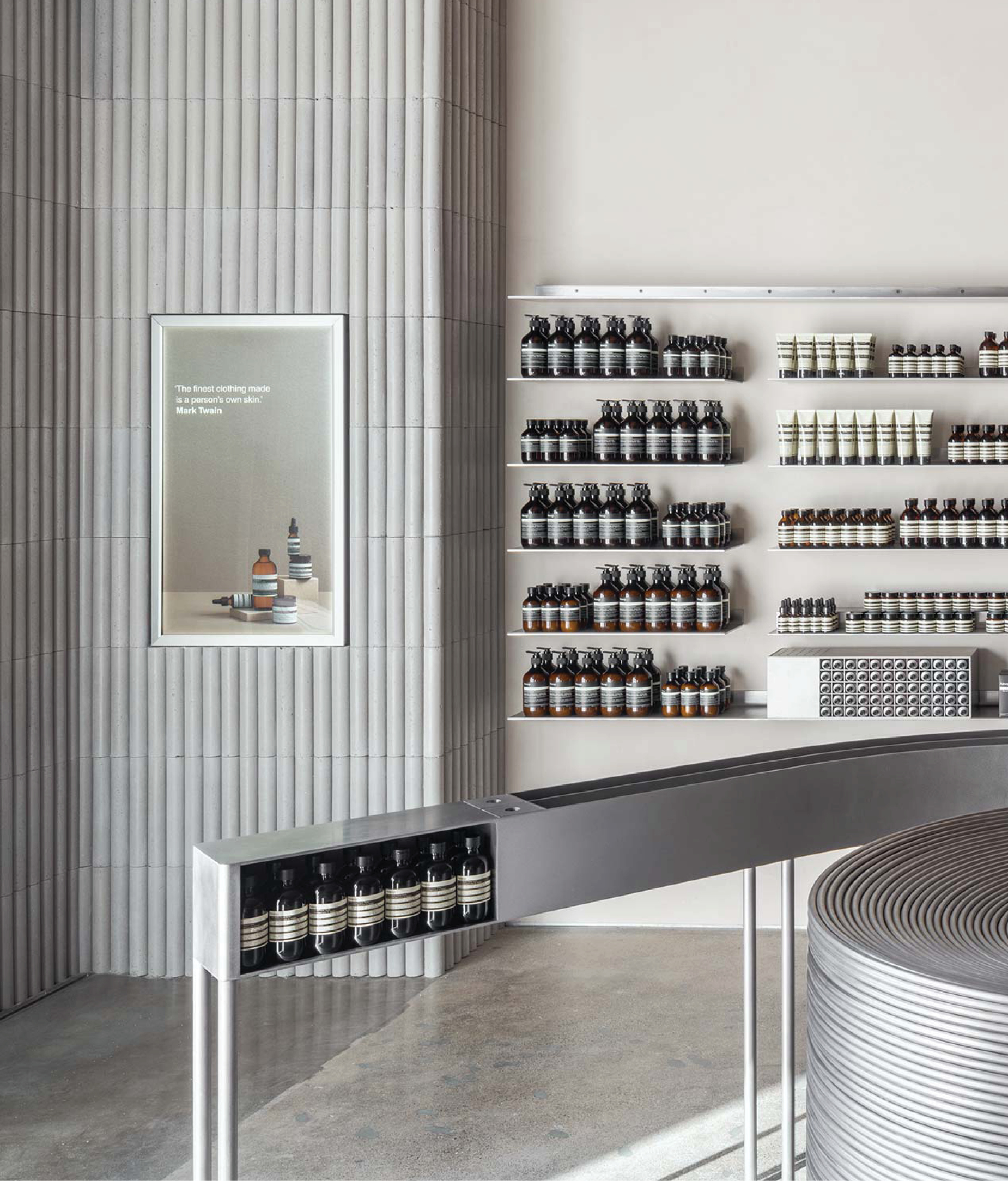This environment informed the design for Aesop Corte Madera, created by our in-house Design Department. Situated within an open-air retail complex, the store responds to its bustling surrounds with achromatic calm, with a striking façade fashioned from ribbed concrete, recalling the mountain’s many faces.